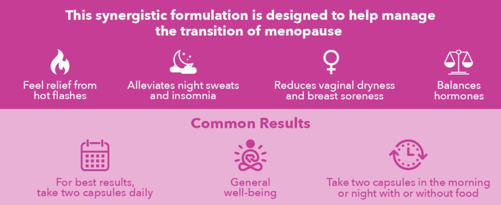 These ingredients work together to offer natural relief from the discomfort of menopause, helping women to feel more balanced and in control of their symptoms.